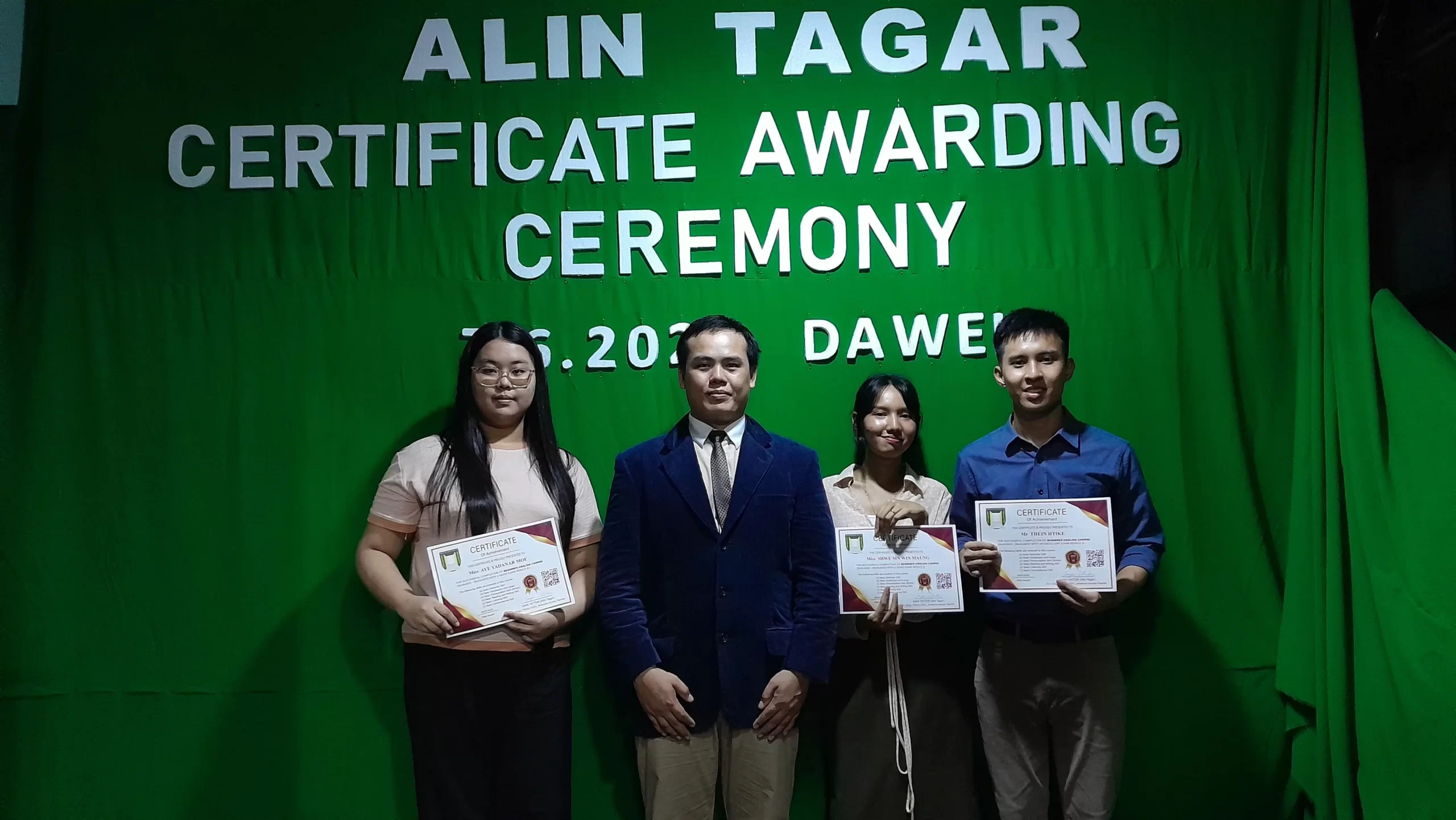 The certificate awarding ceremony 2022 – 2023 was taken place in Alin Tagar English Language training School in Dawei, Myanmar on 7th June 2023. The eligible students of Alin Tagar were awarded the certificates for the successful completion of Alin Tagar English courses in the specific period. Over 30 students were present to the event. They were served with cheese cakes and orange juice.